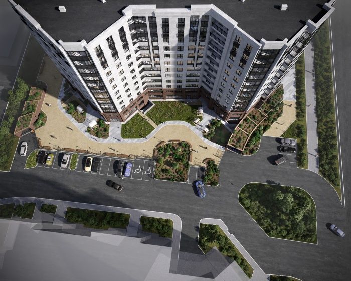 Это позволяет не устанавливать ступени и пандусы, что сделает комфортным доступ в жилой комплекс для любого человека. Проект включает квартиры от одной до трех комнат площадью от 34 до 74 кв. м.