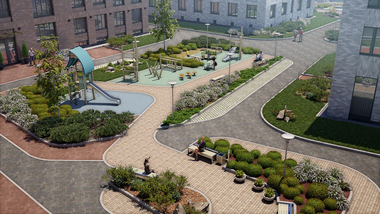 Концепция благоустройства разработана сучетом смены сезонов исоздает разную атмосферу водворе взависимости отвремени года. Весной жители дома смогут насладиться ароматами цветущих растений, выходя издома. Летом двор наполнится яркими красками, аживая зеленая изгородь, карликовые деревья ихвойные растения подчеркнут камерную, почти загородную атмосферу клубного дома.