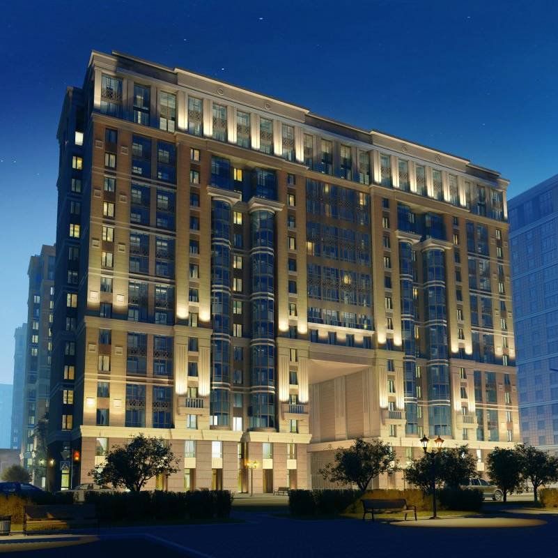 Среди отличительных деталей архитектурного облика — обширная площадь панорамного остекления, шестиуровневый арочный выезд в центральной части дома, обилие декоративных деталей: навесных карнизов, колонн и других элементов. В вечернее время фасады красиво подсвечиваются.