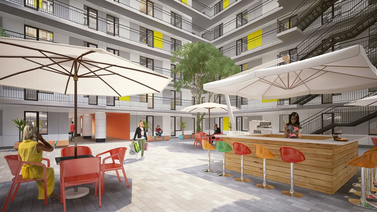 Дворы будут закрытыми, без автомашин, что обеспечит тишину и комфорт. Первые этажи зданий предназначены под коммерческие помещения — здесь появятся продуктовые магазины, кафе, салоны красоты, аптеки. В первой очереди запланирована наземная автостоянка, на которой можно будет разместить 108 автомобилей.